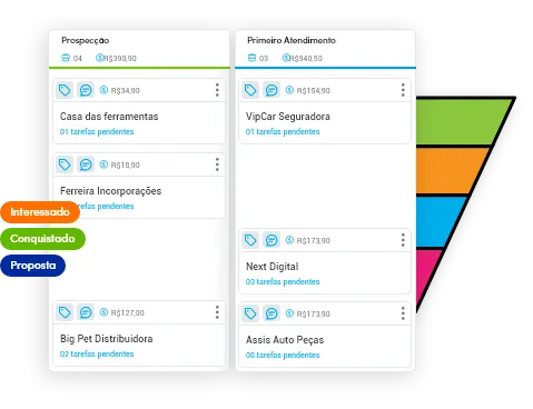através de um kanban, você cria etapas personalizadas de acordo com a sua necessidade para alocar os novos leads que chegarem no crm e assim gerenciar de forma organizada e profissional todo o processo de venda.